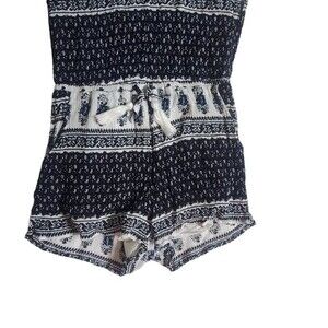 Brand: Very J. Occasion: Casual. Size Type: Regular. Size (Women's): S. Material: SELF: 100% rayon. LINING: 100% polyester. Neckline: High neck. Style: Shorts romper. Sleeve Length: Sleeveless. Color: Blue. White. Features: Hook and eye closure at the back neckline. Elastic waist. Lined. Tie at the waist with tassels. Pockets. Keyhole cutout.
