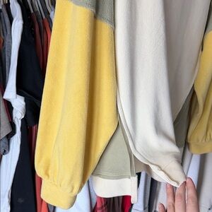 Colorblock top in the softest, comfiest material. Slightly stretchy and lightweight but warm. Slits at side and somewhat ballooned sleeves near the wrist.
