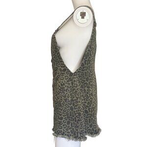 Stylish sleeveless mini dress with a square neckline, green leopard print, button-down front, front pockets, and frayed hem, perfect for casual outings or summer days.