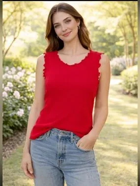 Sleeveless ribbed tank with delicate ruffle trim at neckline and armholes. Soft stretch fabric for comfortable everyday wear. Bright red shade pairs well with casual denim or skirts.