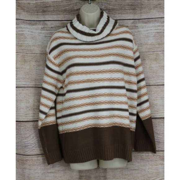 Very J Womens Knit Turtleneck Striped Oversized Sweater Sz Small Ivory Brown