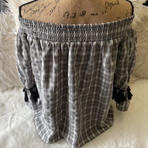 EUC Very J off shoulder top with cute tassels no rips stains holes or discoloration. Cleaned and sanitized. All sales are final.