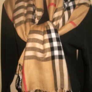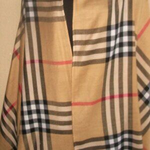 A very large plaid scarf - done nicely with fringed and sewn edges - with no brand and no materials are noted. The textile is soft and medium heavy - not limsy atall and woudlbe warm in winter. Uses are many from muffler to shawl to almost a poncho. orwatever your iow creativity suggests.Quitea nicepiece - looks elegant.Dimensions are 76" long X 29"wide.