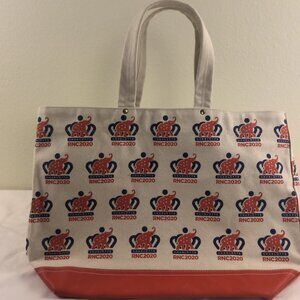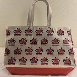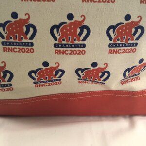 Very large tote bag from the 2020 RNC Charlotte Convention, red, white and blue with elephants, very heavy canvas, large inside canvas pocket, grommet straps, never used, very clean and in perfect shape. Size 19x14.25x6.75 with additional 7.25 handle drop