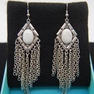 This is a very nice set of Silver (no markings as to Silver content), Encrusted Cream Stone Earrings set in a Triangle Design with 14 Chain Dangles.