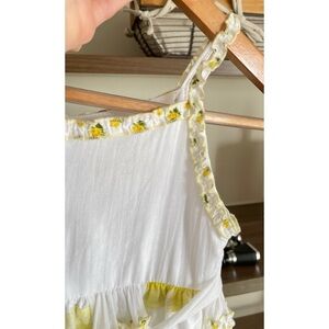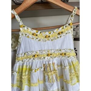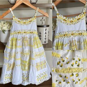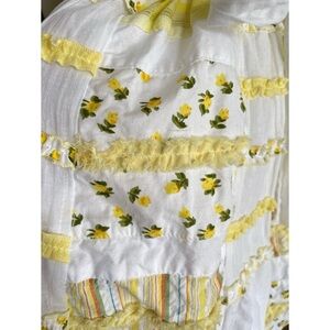 Charming Biscotti dress with yellow stripes. Patchwork design with delicate floral accents. Perfect for casual outings.
