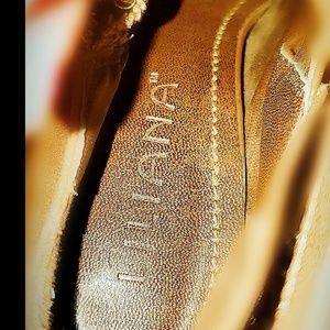 Deep tan color, closed toe, gold stiletto heel with buckle ankle straps