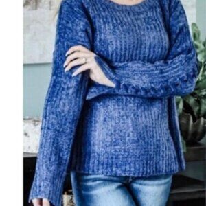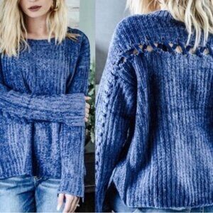 Ultra soft chenille blue sweater with lacing detail on sleeves and back!