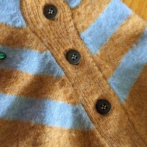 This Sweater from Cloth Logic is made from 80% lambswool and is so soft and cozy. It's a mustard yellow colour with grey stripes and measures 21 inches from shoulder to bottom hem. This is a great item for those who love soft sweaters and don't mind handwashing... The sweater has some minor pilling under the arms and does require special care.
