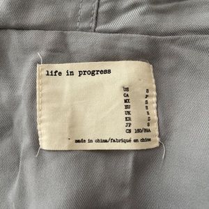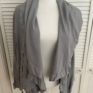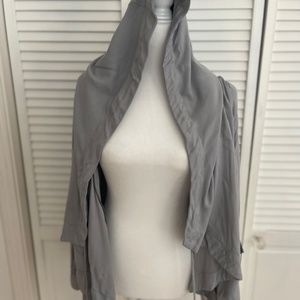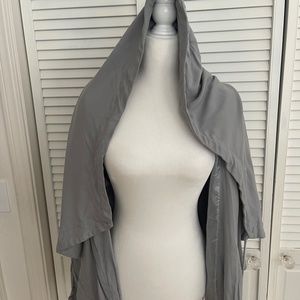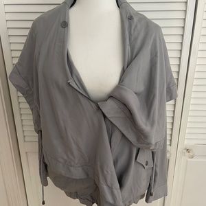 Very Unique Grey casual jacket. Can be worn many different ways, with a hood cape style, open in front or asymeterically zipped. Button sleeves and pockets. Bottom is adjustable for tightness.