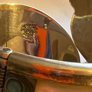 This is a work of ART!!! inlaid opalescent mother of pearl stones in a hinged cuff sterling bracelet. Measures 3 inches at length in face points. Measure 2.5 inches at width of size. Shiny Blue Green opalescent stones surround the piece. Just gorgeous! Stamped TH - Mexico Sterling inside. HIgh quality siler. weighs 1.8 toz.