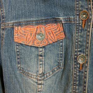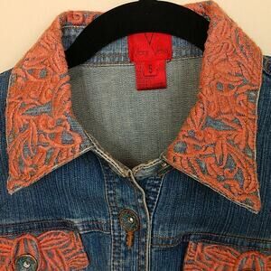 Jean jacket with coral embroidery on collar, pocket flaps, hem & cuffs