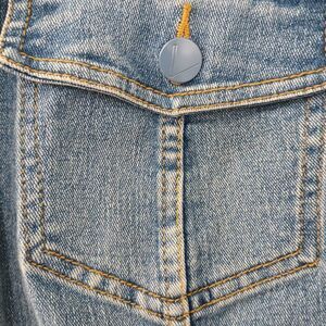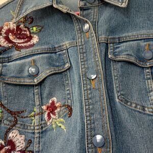 This stretch jean jacket has floral emroidery and is embellished with beading.