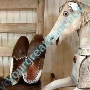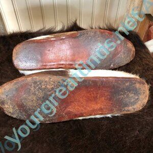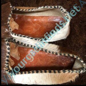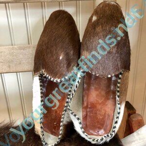 Vintage handmade hair on cowhide loafer shoes or slippers. The soles are hand stitched leather. Not marked with size. Fit like a 7.5 to 80. Soles measure 10" long 3 3/8" wide at the ball of the foot. Very old. I bought them as a decoration. but they could be worn perhaps. Some hair loss.