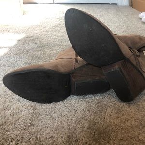 Tan suede booties with pointed toe and a wedge heel.