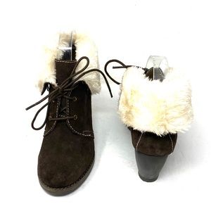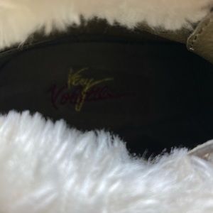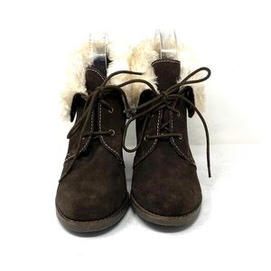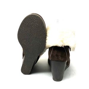 Very Volatile brown wedge sherpa booties. Women’s size 7.5. Wedge height about 3”. In good pre-owned condition. Box not included.