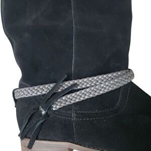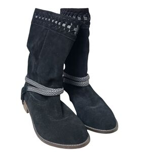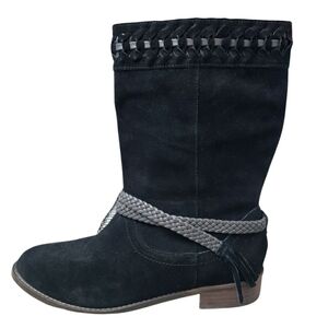 Very Volatile black mid calf boots with gray braided detail and 1" heel. Excellent condition. Size 7.