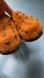Very Volatile Orange color suede clogs with brass rivet studs. Missing one rivet on left shoe front, 4” high heels. Size marked as 7 but fits more like 6 to 6.5. Leather upper