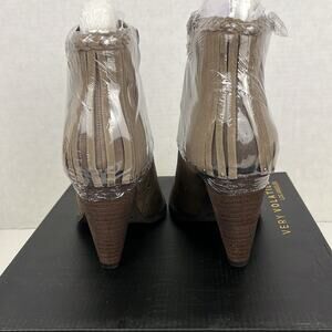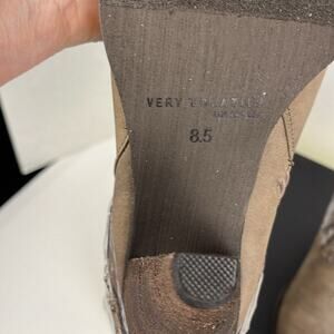 A pair of taupe booties by Very Volatile in a size 8.5. Called Shakee, they have fringe and braid around the top of the boot. There are studs on the bottom of every other strand. They zip up the inside side. The heel is stunning and is about 3.5 inches. Upper: Leather/manmade materials. Textile outsole. Comes with box but it's beat up - ripped on the bottom and one side.