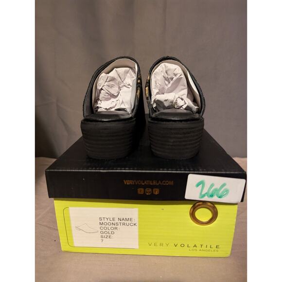 Very Volatile Woman’s Size 7 Black Gold Leather Mule Booties Brand New In Box