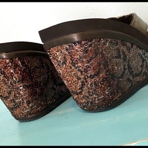 Adorable Brown & Gold, snakeskin color, Very Volitile Wedge Flip Flops. I've worn multiple times but show very little wear. If you've never owned a pair of Volitile Flip Flops- they are by far the most comfortable you ll own. Wear with shorts to the river or with dress slacks to work.
