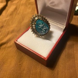 This is a wonderful Paraíba color natural stone from South America and very nice white topaz set all around the center stone. All baguette cut in a wonderful channel design. Also round topaz set on the rim of this wonderful Sterling silver with yellow gold bronzing. It’s a show stopper