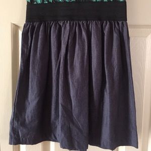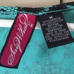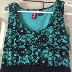Turquoise lace pattern on spandex material with light colored blue jean bottom!