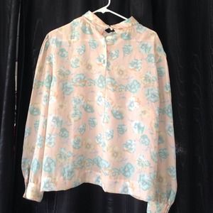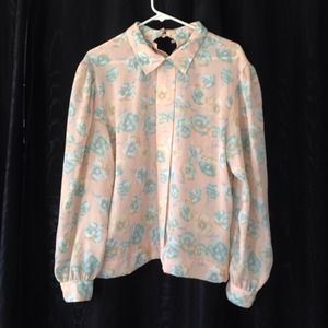 Pink floral polyester long sleeve blouse, with one missing button :(