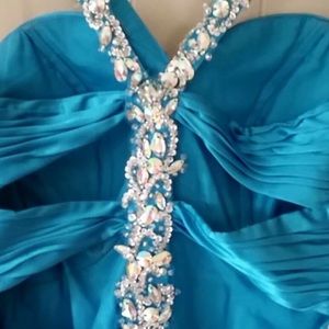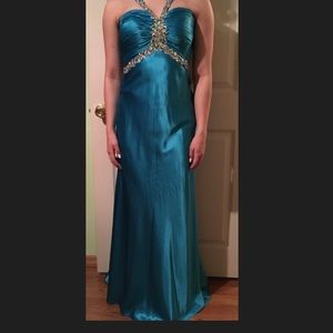 This long aqua teal dress with open back with a braid of beads. Wore one time. ( item#111)