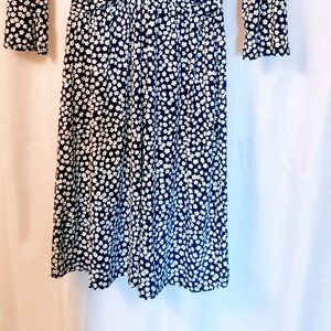 This is a super flattering [ and comfortable!] dress. Dark blue with white flowers, it has a faux wrap style with a ruched waist. Knee length.