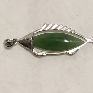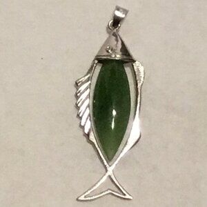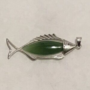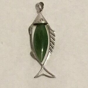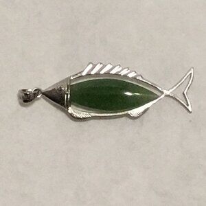Very lovely sterling silver fish pendant with swinging jade stone in the center. Approximately 1-5/8 inches long. Wonderful condition. Sterling mark is near the head of the fish. Will look great with any outfit. Thanks for looking and please feel free to make an offer on anything you want.