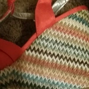 Coral straps with green blue brown Tan pink ex. Clos in the wedge. Very cute shoe.