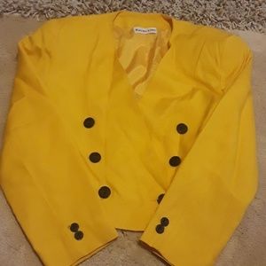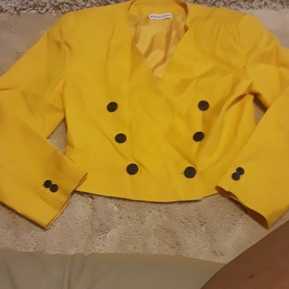 Jacket has six buttons in the front with two that buttons at the bottom and two buttons on the sleeves. Like new beautiful gold color.