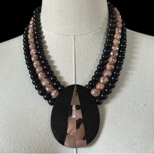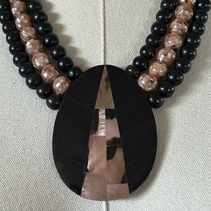 Very pretty black & pink inlay triple strand 1980s statement necklace. Abalone & shell inlay pendant & carved beads. Double hook closure.