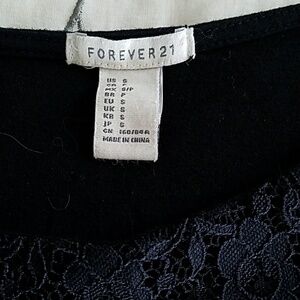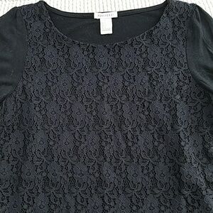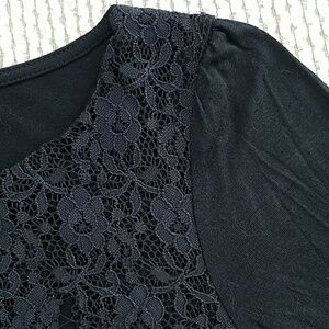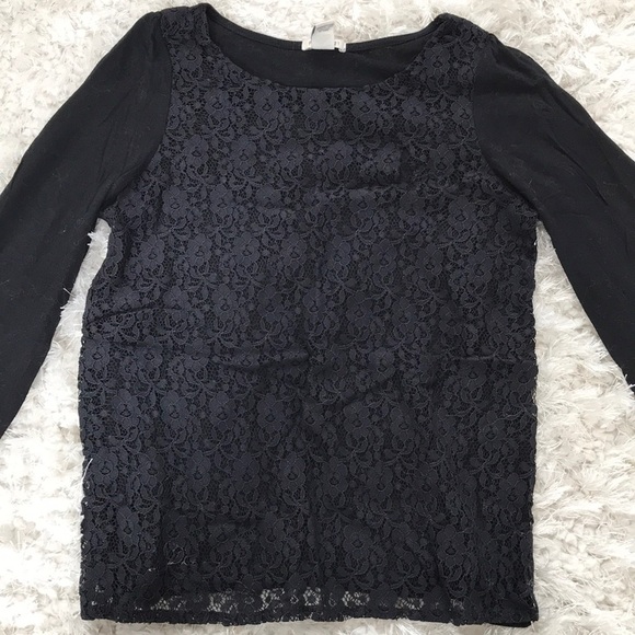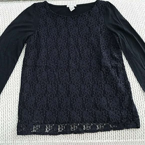 Very pretty, very soft top. Front has crocheted pattern, but underneath is soft material like rest of shirt. Long sleeves with small elastic at wrist. Dark navy color. Like new!! 100 % viscose