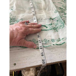 Very sheer cream and green holiday apron. Bells and ribbon design. Fair pre-owned condition.