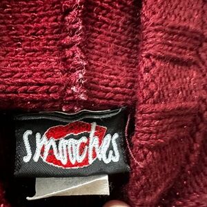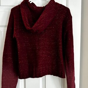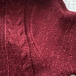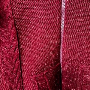 Sparkly maroon/red zip-up hooded knit sweater. This maroon-colored knit sweater. It has a subtle sparkle woven into the fabric, giving it a slightly glittery appearance. The sweater is a zip-up style, with the zipper running down the center front. It has long sleeves, and the cuffs appear to be a ribbed knit. There are also what seem to be kangaroo-style pockets at the lower front