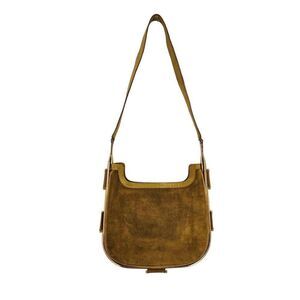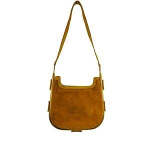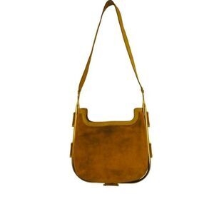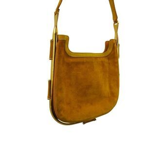 This rare vintage Gucci bag showcases a minimalist yet luxurious design, crafted from rich mustard suede and accented with reconditioned 24KT gold wrap-around bar hardware. The structured silhouette features a sleek, curved open-top style, allowing for easy access to essentials. An adjustable shoulder strap adds comfort and functionality, making it an elegant yet practical choice for any occasion.