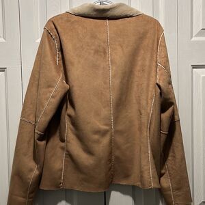 Preowned jacket. Has a couple stains but no rips. Microsuede or suede not sure of material type but very soft. Functioning zipper. Lightweight.