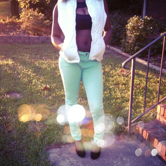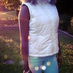 White bubble vest with hood. Can wear with pretty much anything and look awesome! Size: Medium. 💜💋 [Shell: 100% polyester. Lining: 100% cotton. Filler: 100% polyester. Faux fur: 100% acrylic.]