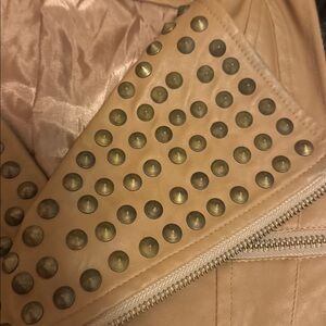 Fun leather tan studded vest! Looks like a tiny faint stain on the right shoulder but I took a photo sold as is!
