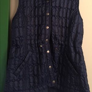 Navy blue fall/winter vest with black collar. Super lightweight but still keeps you warm. Has buttons going down, pockets, and drawstring around the waist.