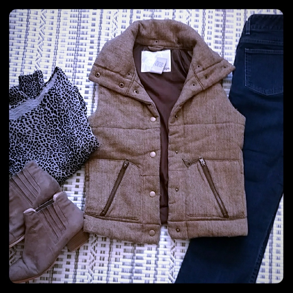 Brown vest that snaps close. Small zip pockets with pockets behind that are open. Cute patterned detail. Hardly worn.