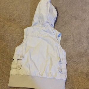 Fuzzy inside vest, pocket on front with button. Light brown color. Zip up