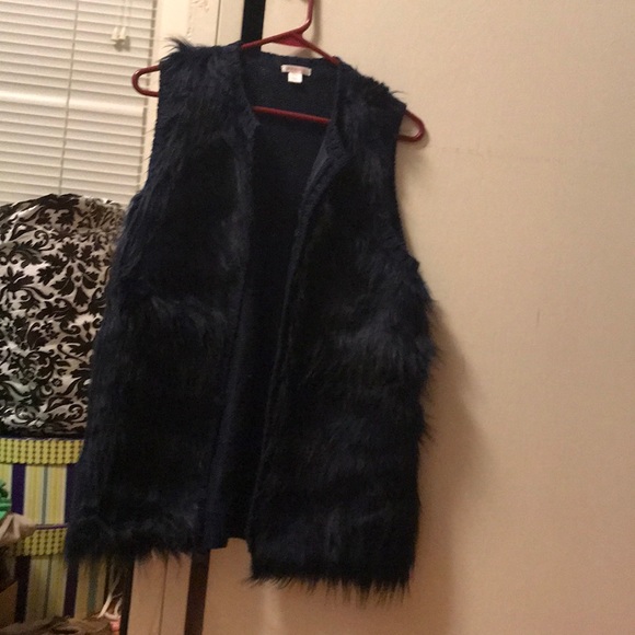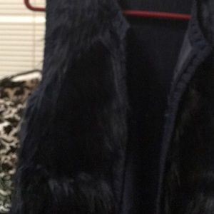 Navy blue faux fur vest looks great with jeans