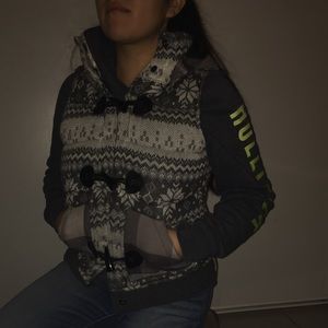 Gray with white has a lovely winter pattern on the outside is super warm has soft padding inside and the hood can be taken off if wanted