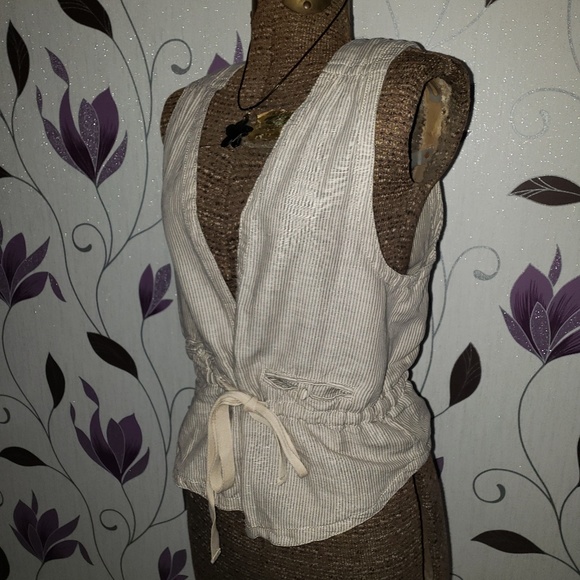 Really cute tan and gray striped tie-front vest.