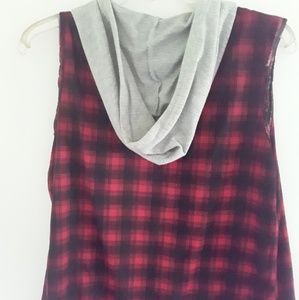 Plaid vest. Button up with grey hood.