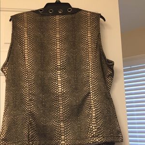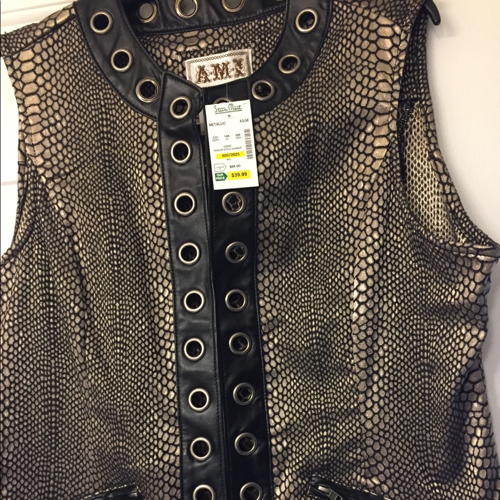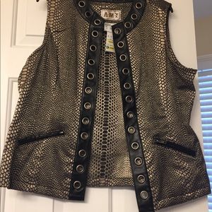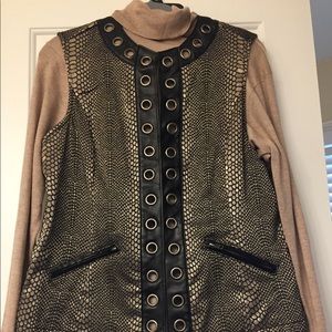 Very pretty vest in black and kinda metallic taupe with pockets with leather like trim. Can wear opened or closed. Size XL with a little stretch. New with tags.