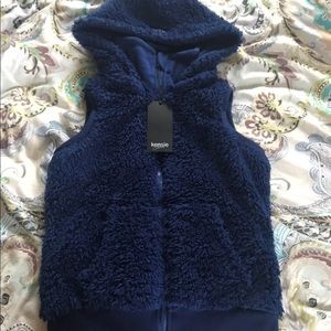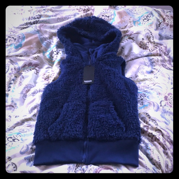 Super cute warm and fuzzy vest beautiful sapphire blue color by KENSIE removable hood side pockets.Brand new size XS can fit small size as well.